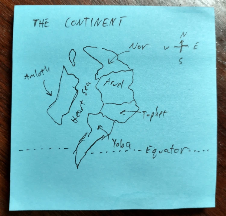 I haven’t thought much about geography, and have avoided making a world map because I feel like fantasy writers tend to waste a lot of time making maps before they’ve written anything.